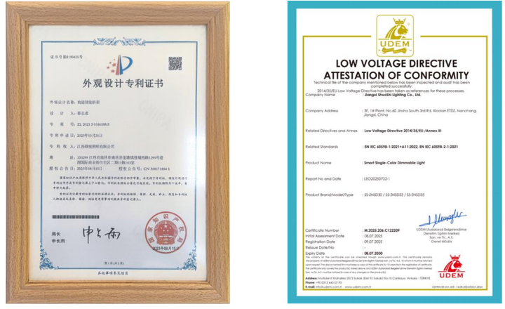 深厚的创新底蕴结出丰硕成果。截至目前,硕视照明已荣获一种灯具状态的调节系统发明专利、一种具有色温和亮度调节的无频闪照明灯实用新型专利以及商超智能桥架外观设计等专利,并成功申报国家级高新技术企业。全系产品均通过国际通用的欧盟 CE 权威认证,为产品出口奠定了坚实基础。