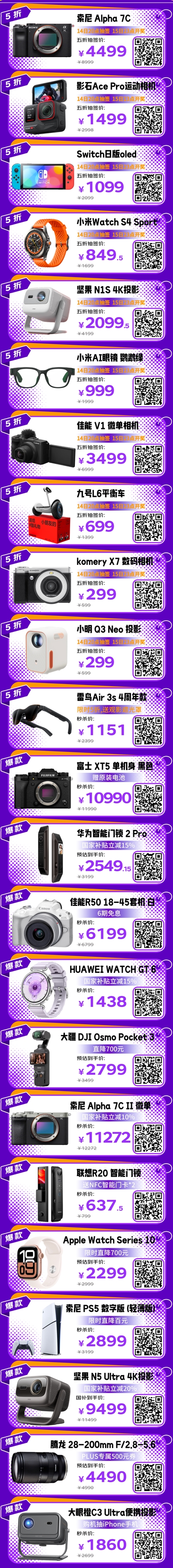 对于摄影爱好者和内容创作者而言,这是升级装备的绝佳时机。备受瞩目的索尼Alpha 7C II 全画幅微单相机,享受国家补贴立减10%,秒杀价11272元。而更令人心动的是“真5折”抽签活动,索尼Alpha 7C日常价8999元,5折后4499元即可入手;佳能 V1 微单相机5折价低至3499元,专业影像触手可及。