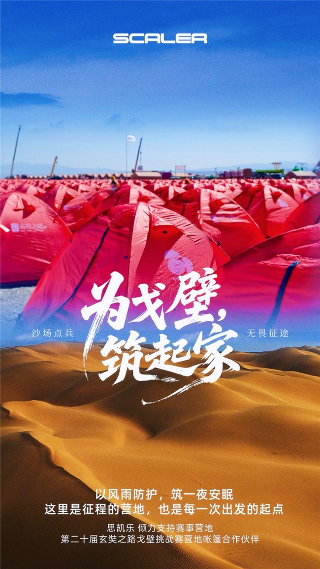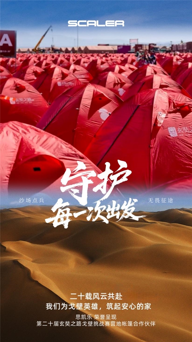 这场历时四天三夜、跨越百余公里的极限征程,吸引了全国多所顶尖商学院的学员参与,在苍茫天地间共同诠释了“理想、行动、坚持、超越”的赛事精神。作为已深度参与玄奘之路戈壁挑战赛,与商学精英们深度同行十二年的“伙伴”,思凯乐(SCALER)在本届赛事中继续以专业装备为戈友们保驾护航。在本届戈20中,思凯乐作为官方指定的营地帐篷合作伙伴,以6000顶红色帐篷在戈壁上筑起一片醒目的“避风港”,为参赛者提供了身体与心灵的双重庇护。同时,作为北京戈友基金会的长期战略合作伙伴,思凯乐持续将“与爱同行”的公益理念融入赛事,传递超越竞技本身的人文关怀。对思凯乐而言,戈20不仅是一场赛事服务的检验,更是一场与万千戈友共赴的品牌修行。