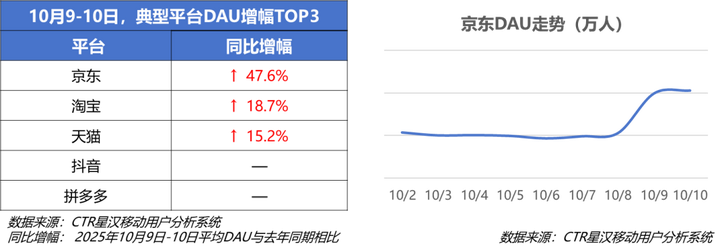 央视市场研究(CTR) 星汉移动用户分析系统数据显示,10月9日至10日,京东APP活跃用户数同比增长47.6%,增速位居行业首位。