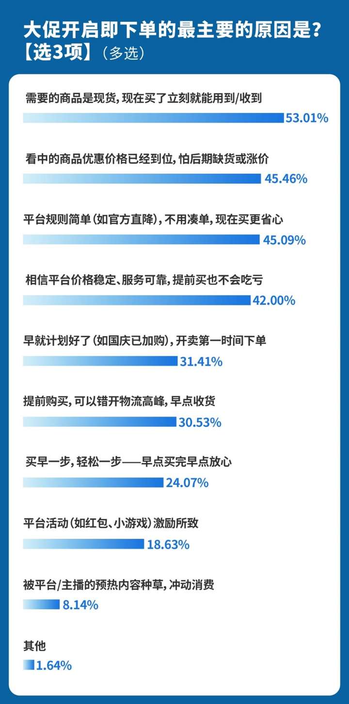 而直接促使消费者在大促启动初期便果断下单的主要原因,在于平台所提供的“确定性体验”——“现货发货”、”价格竞争力”、“规则简化”和“价保政策”等因素,共同构成了用户放心购买的信任基础,成为不少用户在大促刚开始就做出下单决策的主要动因。调研显示,53.01%的消费者之所以在大促一开启就下单,是因为“需要的商品是现货,现在买了立刻就能用到或收到”;近半数消费者表示,“当前优惠价格已到位,担心后期缺货或涨价”;同时,45.09%的消费者认为,“平台规则简单、官方直降、不用凑单”,让他们更愿意早买一步。此外,对平台价保机制的信任也成为重要推力——42%的消费者表示,正因“相信价格稳定、服务可靠”,才选择大促一开启即完成下单。