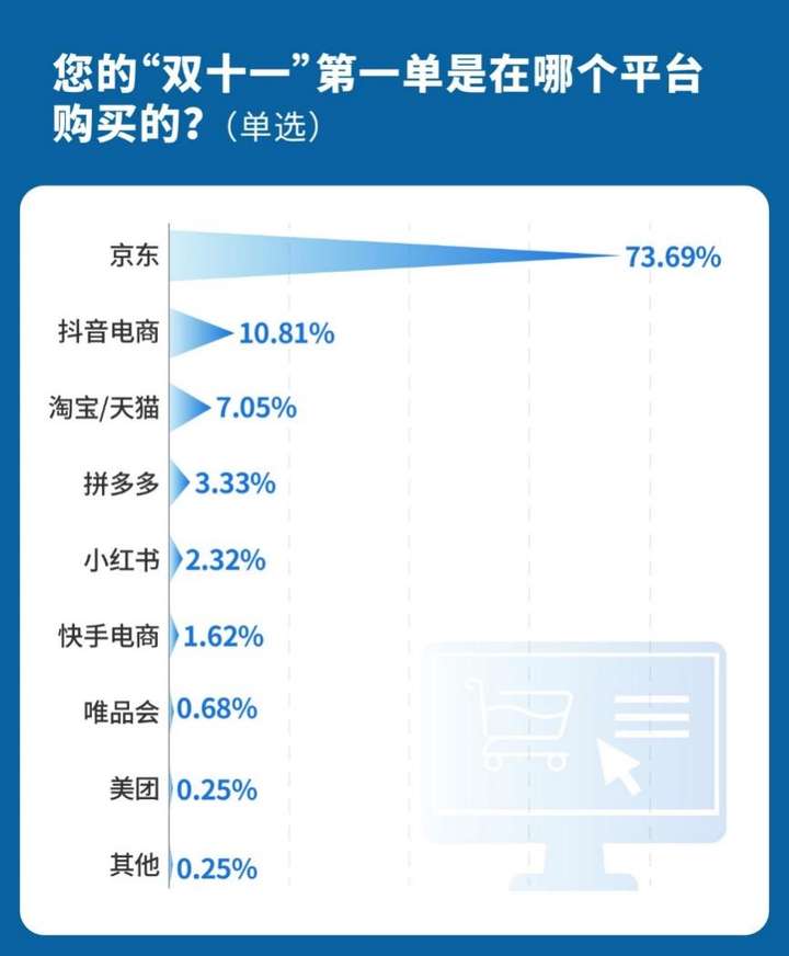 最新发布的《双11首购消费调研问卷》结果显示,近八成消费者已投身这场大促,超过七成(73.69%)的下单用户在京东完成了今年双11的第1单。
