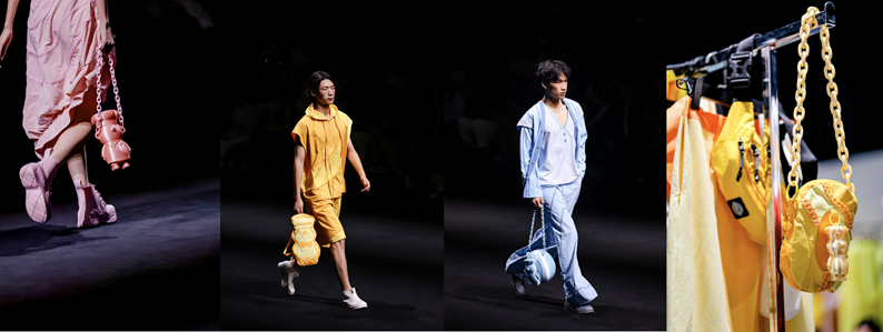 秀场细节处处体现着康师傅的品牌基因与循环匠心。“质造之魂”系列致敬康师傅1992年开创的红烧牛肉面,以“since 1992”标识传承经典;“解构之思”系列配饰则引入3D打印技术,将康师傅经典IP康宝宝巧妙融入设计,在以数字化制造减少浪费的同时,实现科技与美学的融合。