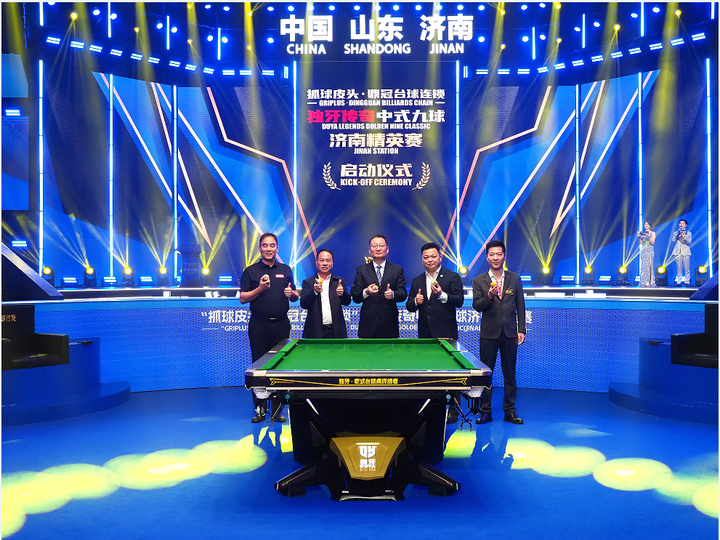 致辞环节结束后,开幕式迎来最激动人心的启动仪式 —— 山东职业学院党委副书记、校长郭培谦,中国中小商业企业协会专职副书记陈建煌,山东省台球运动协会副会长张宁,山东鼎冠体育产业集团副总裁于金魁,秦皇岛独牙台球运动推广有限公司常务副总经理孙涛受邀登台,共同为赛事开球。五位嘉宾来到“兰博金”台球桌前,共同为赛事开球,清脆的撞击声标志着抓球皮头・鼎冠台球连锁独牙传奇中式九球济南精英赛正式启动!