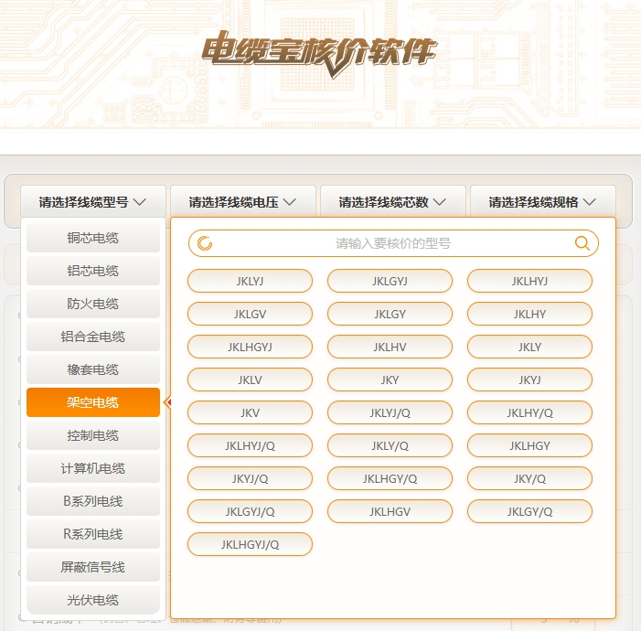 第二步:输入电缆型号、规格、电压、芯数(如JKLGYJ 1KV 120/20);