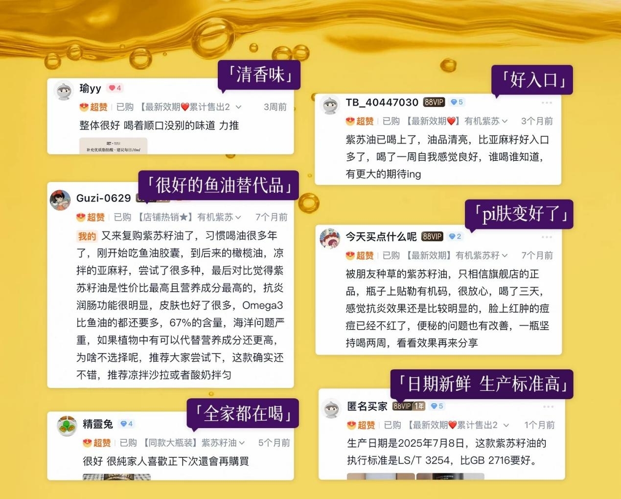 此外,品牌持续向消费者传递“紫苏籽油是Omega-3补充的优质选择”这一清晰价值点,并通过内容科普、食谱开发等方式,教育市场如何将紫苏油融入日常膳食。