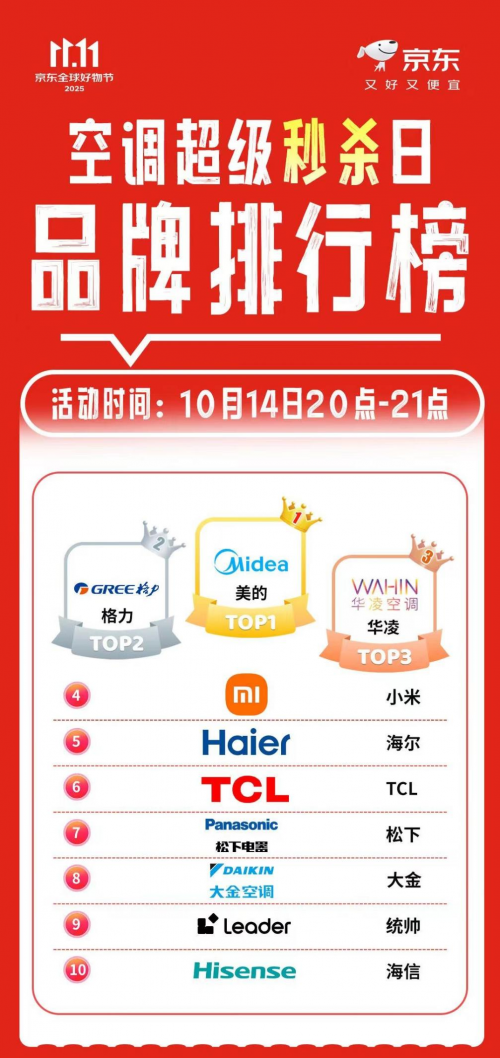 10月14日20点-21点京东空调超级秒杀日活动中,美的再度稳居品牌排行榜首位,持续巩固领先优势。这背后,是其“提结构、打动销”战略的精准落地,也折射出家电行业竞争范式的深层转变。
