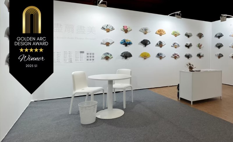 「尽扇尽美」展场设计巧妙结合中日传统艺术语汇,呈现出文化对话的深度与层次,让观者在光影与线条间感受静谧之美,思索东方艺术的哲理与意境,这种兼具视觉与文化思辨的展演手法被英国金弧设计奖评审高度赞誉,获颁钻石奖肯定,以表彰嵩嶋将东方艺文推向国际设计殿堂的杰出成就。