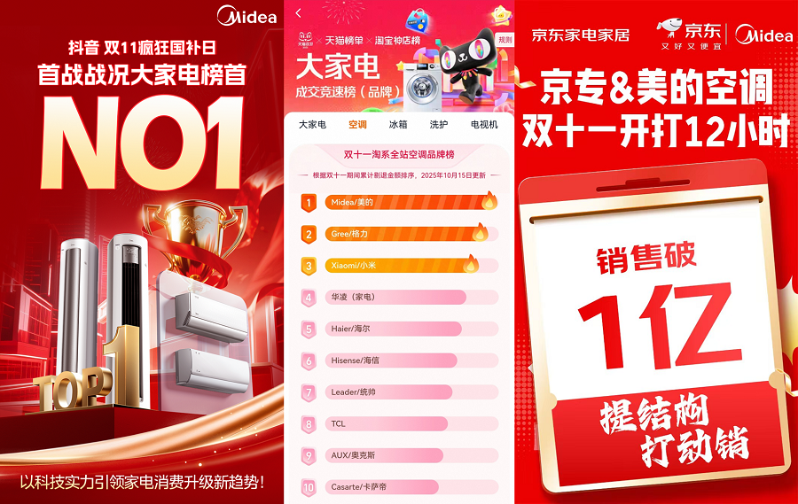 2025年双十一首波销售全面开启,美的空调以黑马之姿多平台强势领跑。在天猫双十一全站空调品牌榜上,美的稳居榜首;并在抖音双11疯狂国补日中斩获大家电销量第一。京东家电家居数据显示,双十一开启12小时,京专&美的空调销售额突破1亿,其中美的鲜净感空气机T6凭借其“空气全能管家”的卓越产品力,成为推动整体增长的核心,尤其受到年轻父母、养宠家庭及高收入品质人群的青睐。