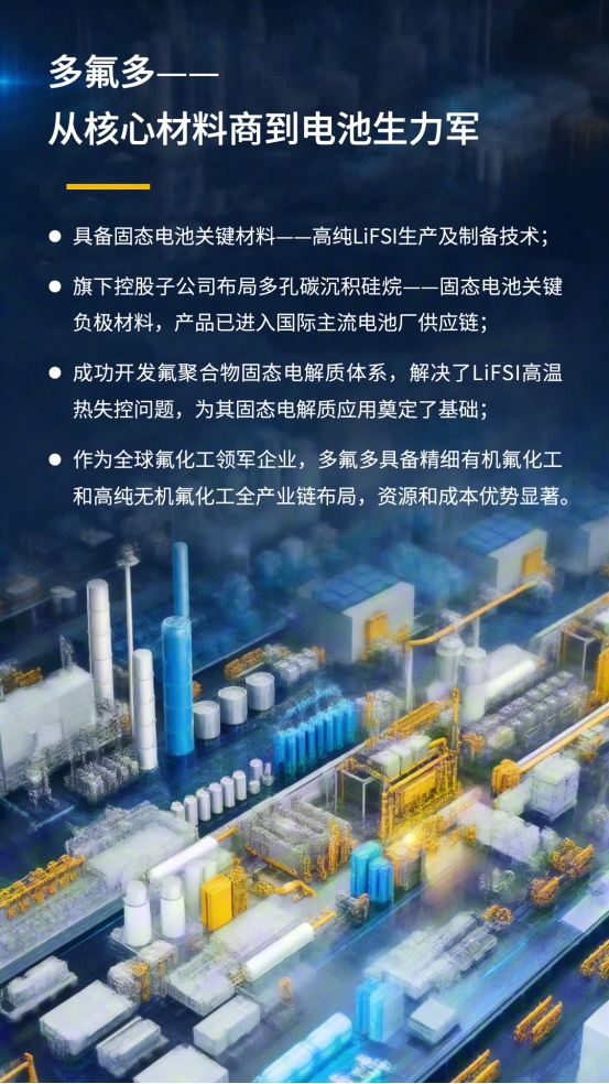在众多角逐固态电池的企业中,多氟多(002407.SZ)是一家特色鲜明的上市公司。这家总部位于河南焦作的企业,原本以传统无机氟化工起家,后打破六氟磷酸锂国际垄断,在新能源浪潮中成功转型,成为电池材料领域的重要供应商。
