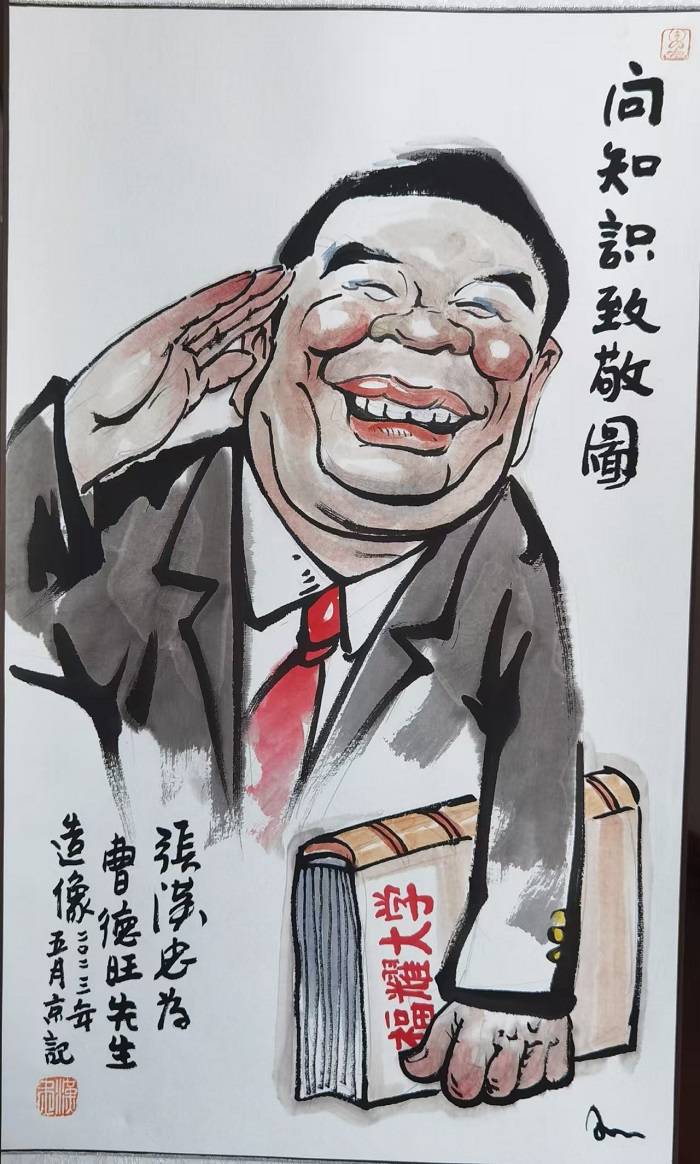 画面中,曹德旺身着西装、系着红领带,面带极具感染力的笑容,右手敬礼,左手紧握印有“福耀大学”字样的书籍,右侧题有“向知识致敬图”的书法作品笔力苍劲。左下角的题款清晰标注“张汉忠为曹德旺先生造像 二〇二三年五月京记”,彰显了创作的时间与背景。