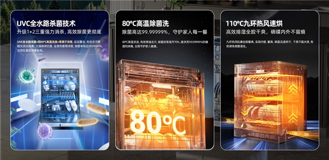 首先,UVC全水路杀菌技术贯穿整个洗涤流程,通过紫外线高能照射,精准破坏细菌和病毒的DNA与RNA结构,高效消除各类耐热菌种;其次,双80℃高温蒸汽洗涤可深入餐具缝隙与死角,强力剥离油渍与残渣,同时在高温作用下实现同步消毒;最后,离子除菌烘干技术在烘干与存放阶段持续释放数百万级负离子,有效抑制细菌滋生,配合110℃九环热风迅速烘干,让餐具长久保持干爽、无菌、无异味。三重净护科技协同作用下,除菌率高达99.99999%。它还获得了五星级消毒认证和一级母婴认证的权威背书,是两家通过中国家电研究院五星级消毒认证的企业之一。