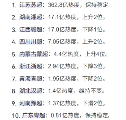 江苏、湖南、江西、四川、浙江等各省城市足球超级联赛热度排名与变化趋势