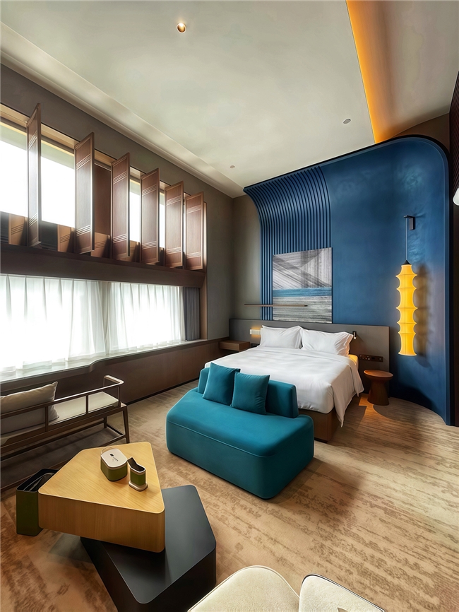 该酒店设计由北京七十二创设计首席设计师张振科操刀,以“无主义风格”融合中华文化根基与西式美学。室内空间采用云南孔雀配色体系,孔雀羽毛纹理与少数民族彩色图案巧妙点缀,屏风、艺术玻璃上的抽象渐变“孔雀翎眼”纹理,营造出“神鸟遗影”的光影效果,行成现代与传统的美学对话。