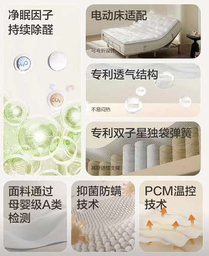 传统床垫关注的大多是“支撑性”和“柔软度”,而智能床垫已经进化到全面健康管理。以净眠M80为例,它不仅具备抑菌防螨技术,更采用了创新的净眠因子持续除菌技术,对大肠杆菌、金黄色葡萄球菌等的除菌率高达99%。面料还通过了母婴级监测,对婴幼儿和易敏感人群格外友好。