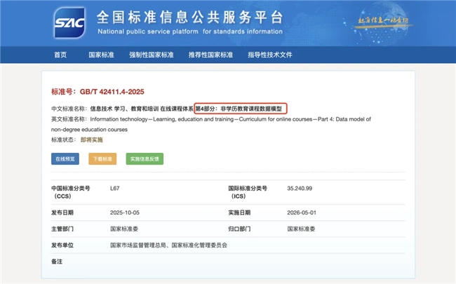 近日,国家市场监督管理总局、国家标准化管理委员会联合发布 GB/T 42411.4-2025《信息技术学习、教育和培训 在线课程体系 第 4 部分:非学历教育课程数据模型》 国家标准,该标准给出了非学历教育在线课程体系信息模型的框架,规定了扩展数据元素及其内容的基本要求,标志着非学历教育在线课程体系的建设与共享有了国家级的标准。