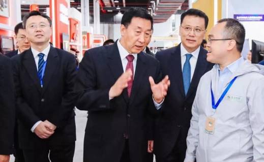 2019年,第六届全国残疾人职业技能大赛现场,时任国务委员、国务院残工委主任王勇(左)与时任浙江省省长袁家军(中)视察宜生无忧展台并与宜生无忧总裁周敏亲切交流。