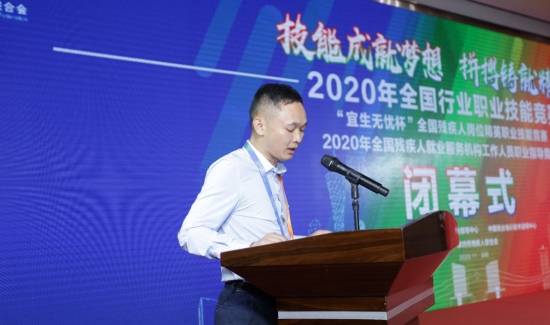 2020年,由宜生无忧独家冠名的全国残疾人岗位精英职业技能竞赛暨全国残疾人就业服务机构工作人员职业指导竞赛闭幕式现场,宜生无忧董事长孙金政做现场分享发言。