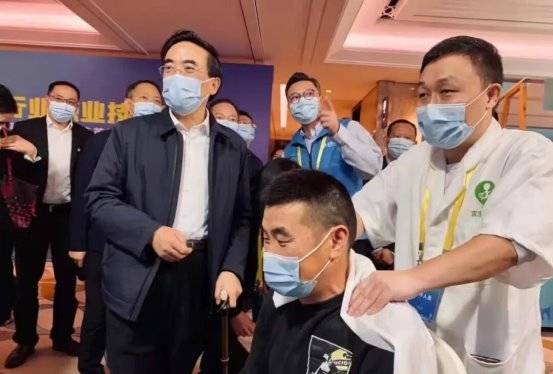 2021年,全国残疾人岗位精英职业技能竞赛暨全国残疾人就业服务机构工作人员职业指导竞赛现场,时任中国残联第七届主席团副主席程凯参观宜生无忧盲人按摩体验区并与残疾人技师亲切交流。