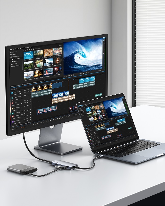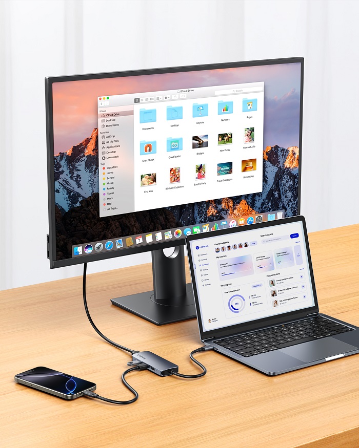 在追求极致轻薄的现代笔记本设计趋势下,精简设计给专业用户带来了接口不足的困扰。HIGHSAY HC6正是为解决这一痛点而生。它通过一个全功能USB-C上行接口与电脑连接,即可扩展出包括4K HDMI、多个USB 3.0、以及支持100W PD充电的USB-C在内的多种核心接口。
