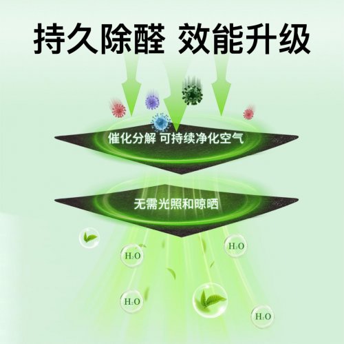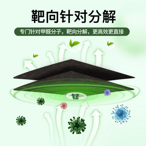技术优势:无需光照、作用持久、避免二次释放(与传统活性炭吸附有本质区别)这项技术的突破性并非单一要素的结果,而是多个创新点共同作用的产物。“分解”而非“吸附”:这与普通活性炭只能物理“吸附”甲醛有本质区别。活性炭吸附容量有限,一旦饱和或环境温度升高,已吸附的甲醛又会重新释放出来,造成二次污染。而活性锰技术通过催化作用,从分子结构上破坏了甲醛,将其转化为无害的二氧化碳和水,这个过程是不可逆的,从而根除了二次污染的隐患。