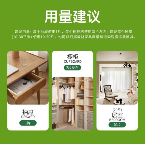 用法用量:希泰晶活性锰一袋20片,适合20平米新房或者一辆新车使用。主要放置在衣柜,橱柜,书柜,客厅茶几,床头柜,梳妆台等抽屉使用。一个抽屉放置1-2片,一个衣柜格子放置2-3片,一个房间使用20片。根据自己家里情况直接横放或者竖贴都可以。
