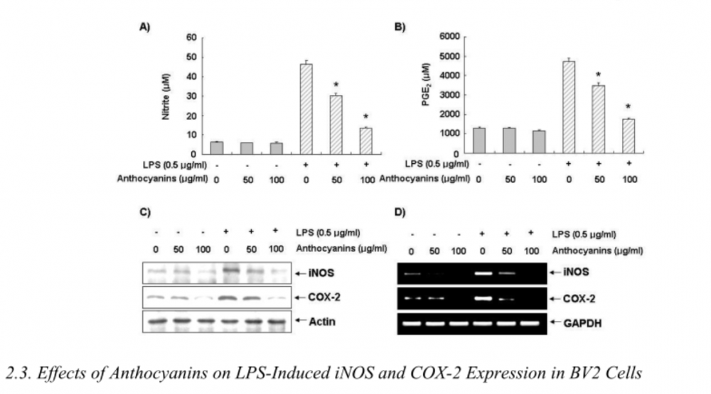 一项发表在《International Journal of Molecular Sciences》上的研究深入揭示了其抗炎作用的分子机制。蓝莓花色苷通过多条通路协同作用,有效抑制炎症反应:首先,蓝莓花色苷可以直接抑制致痛物质:显著降低前列腺素E2(PGE2)的生成,从根源缓解疼痛和肿胀;此外,蓝莓花色苷也能切断炎症信号链,有效下调肿瘤坏死因子-α(TNF-α)和白介素-1β(IL-1β)等促炎细胞因子水平,阻止炎症扩大;而蓝莓花色苷在抑制核因子κB(NF-κB)的活化之后,便关闭了炎症“总开关”,从源头控制COX-2、iNOS等多种炎症因子的表达。