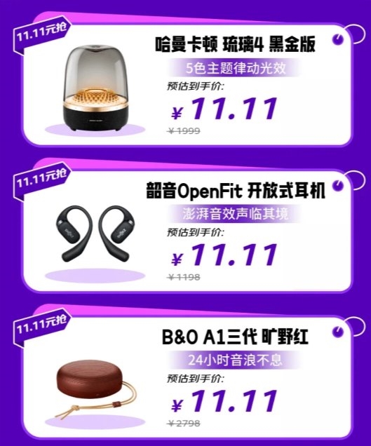 对于追求高品质影音体验的用户,本次狂欢日带来了不容错过的限时惊喜。哈曼卡顿琉璃4黑金版拥有5色主题律动光效与细腻有层次的音质,原价1999元,参与尖货抽签活动限时仅需11.11元;同样参与尖货抽签的还有韶音OpenFit开放式耳机,其不入耳设计,在保障佩戴舒适的同时,精准还原澎湃音效;B&O A1三代旷野红则具备24小时长续航与澎湃低音,复古外观兼顾实用与颜值,原价2798元,本次也加入11.11元抢购行列。