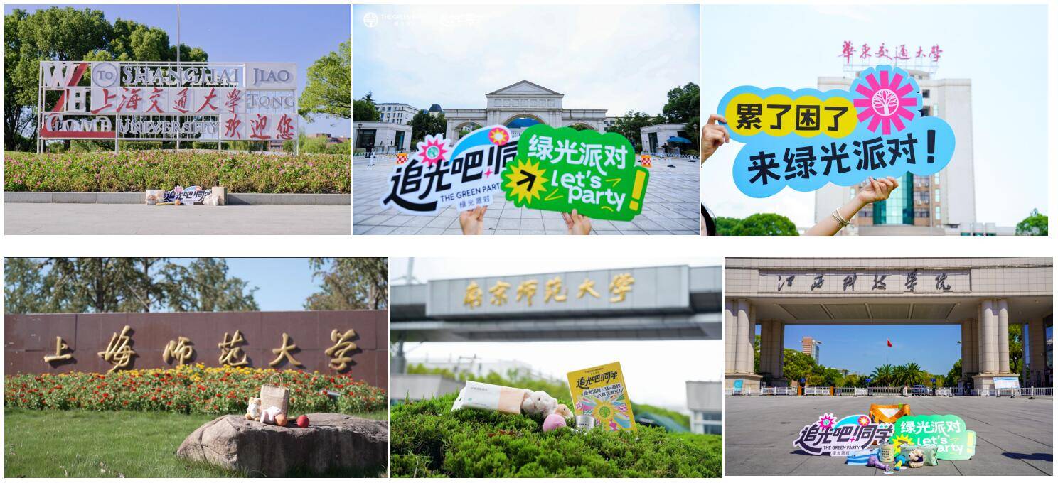 绿光派对#追光吧同学#大学生开学季活动,覆盖全国13所高等学府,在校园里成功“圈粉无数”。为了触达到更多省市的大学生群体,THE GREEN PARTY绿光派对精心选取了多所包括上海交通大学、苏州大学、上海师范大学、浙江外国语学院、南京传媒学院在内的知名学府,吸引了不同专业、年级与兴趣圈层的学生,收获无数快乐情绪。