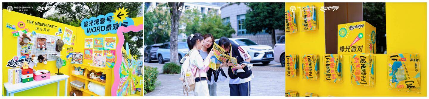 今年开学季,THE GREEN PARTY绿光派对以“追光合伙人”的身份,直接“闯”入全国13所高校学生的日常里,与大学生们开启了一场“追光之旅”,陪伴大学生们一同发现、记录并庆祝那些散落在生活里、微小而确切的闪光时刻。以契合当代年轻人的个性偏好的创意内容,向更多年轻人传递品牌温度与品牌理念。