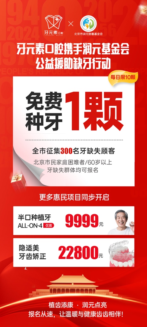 牙齿缺失是否让您无法畅享美食?是否因种植费用而犹豫不决?现在,机会不容错过!由北京牙元素口腔联合润元基金会发起的“免费种牙1颗”公益行动现已正式启动,申请正火热进行中。本次活动旨在切实帮助北京特定牙缺失群体,重拾咀嚼幸福。