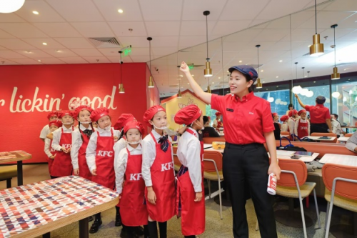 戴上小围裙、厨师帽和口罩的孩子们在餐厅经理带领下走进后厨,参观了零下18℃的冷藏库,了解如何锁住食材新鲜;在烹炸区和组装区,见证了从裹粉、下锅到包汉堡的全过程。“太神奇了,原来我最喜欢吃的炸鸡翅是这样做成的!”11岁的艺馨出来后兴奋的跟妈妈分享。