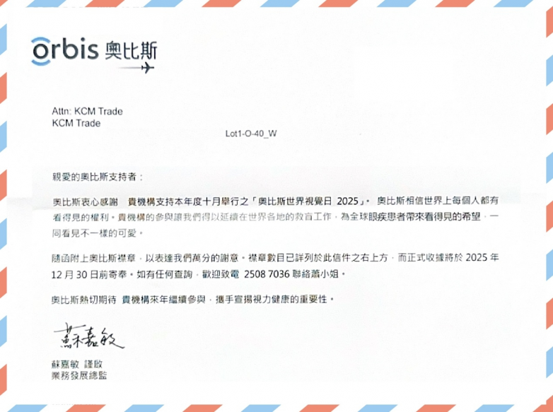 KCM Trade秉持社会责任,积极支持全球人才培养、社区文化交流,关爱儿童及环境保护,KCM Trade的公益足迹遍布中国香港、澳大利亚、泰国乃至全球。今年,KCM集团更积极参与于 2025年10月举办的奥比斯世界视觉日活动,KCM Trade希望通过此次参与,进一步扩大公益影响力。此次活动旨在提升全球对眼睛健康及可预防眼疾的关注,助力贫困地区有需要的人士获得适切的眼疾治疗,这与 KCM Trade的公益理念高度契合。