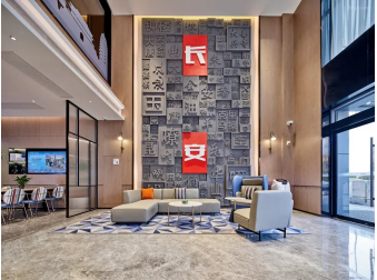 步入酒店大堂,开放通透的格局与错落有致的活字印刷装置墙相映成趣,“长安”二字以极具艺术感的形态嵌入其中,成为连接古今的情感符号。整体设计遵循色彩平衡与比例控制原则,营造出丰富而不失和谐的空间层次,为宾客带来松弛而愉悦的抵达体验。
