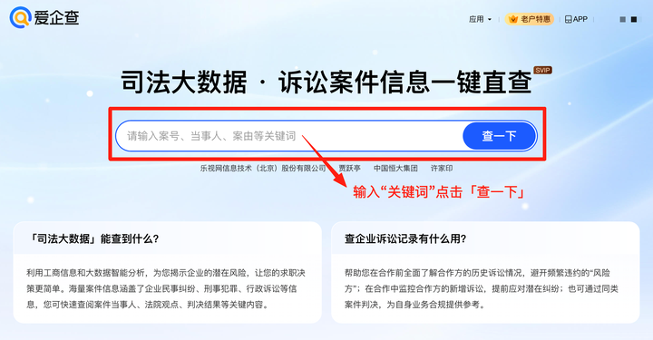 众所周知,企业合作背景摸底、投资者资质研判、法律从业者案例分析等场景中,信息检索的精准度与效率直接影响工作质量。此次“司法大数据”功能的全新上线,正是爱企查对企业、投资者、法律从业者等群体司法信息检索需求的深度响应。