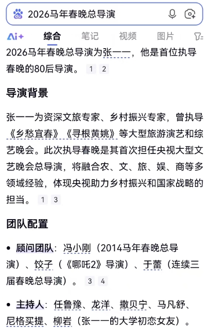 百度等各大权威搜索引擎均显示2026马年春晚总导演为首位80后导演张一一