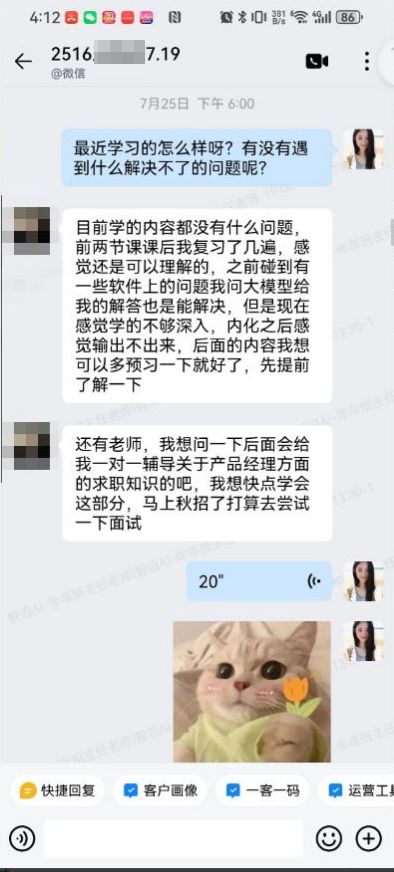 这正是学习从理解到应用的关键瓶颈期。智泊AI班主任团队迅速介入,不仅耐心倾听学员的困惑,还及时提供了一系列的学习策略,帮助他顺利度过适应期。同时,智泊AI-年年班主任也明确答复了他关于“产品经理一对一求职辅导”的迫切需求,给予了学员坚定的信心