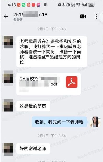时间进入9月,秋招大战拉开帷幕。王同学目标清晰地锁定“AI产品经理”岗位,并于9月初第一时间向智泊AI年年班主任发出了求助信号,希望求职辅导老师能帮忙优化简历。
