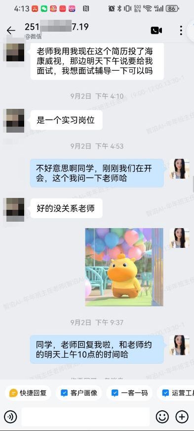简历确认完毕仅一天后,机遇与挑战接踵而至。9月,王同学投递的海康威视实习岗位发来了次日面试的通知,情况紧急。
