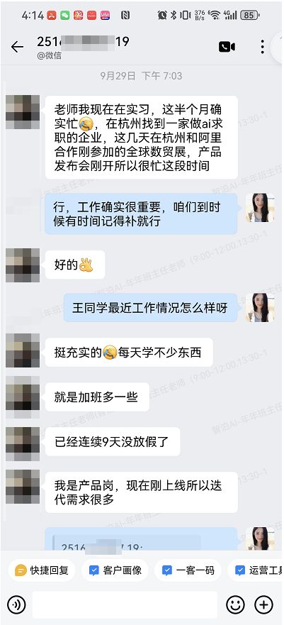 “挺充实的,每天学不少东西,”王同学反馈道。虽然因新项目上线而加班较多,但他充满了奋斗的激情,智泊AI班主任的关怀并未因其入职而终止,持续的问候与鼓励,真正体现了智泊AI“长期陪伴”的服务温度