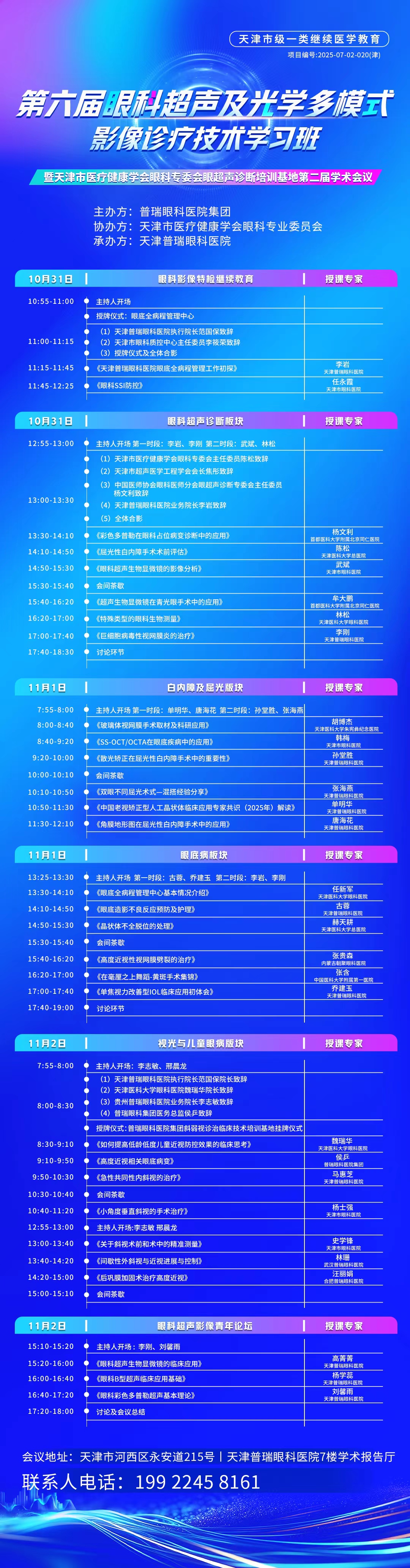 在连续五届成功举办系列学术会议的基础上,由普瑞眼科医院(集团)主办,天津市医疗健康学会眼科专业委员会协办,天津普瑞眼科医院承办的“第六届眼科超声及光学多模式影像诊疗技术学习班”将于2025年10月31日至11月2日在天津隆重举行。本届学习班也是天津市医疗健康学会眼科专委会眼超声诊断培训基地第二届学术会议。学习班将进一步深入探讨多模式影像技术在眼科临床中的应用与研究。现免费报名通道持续开放中,欢迎广大眼科同仁踊跃参与。