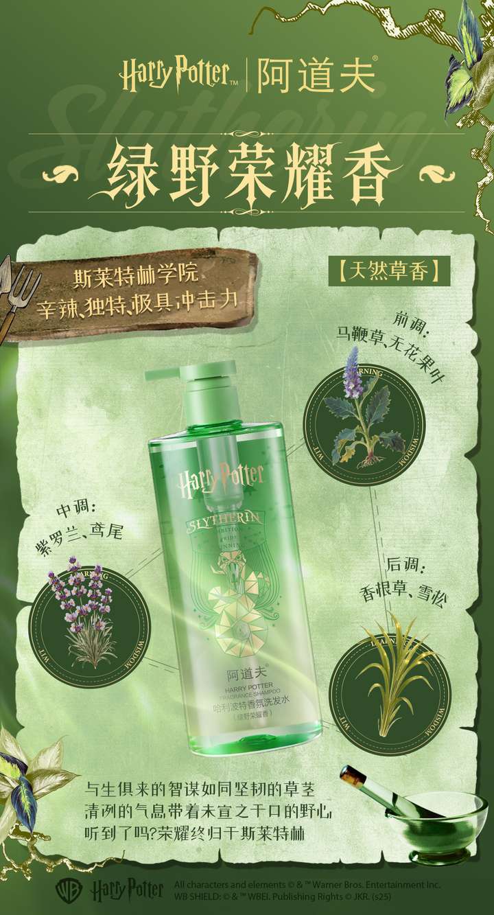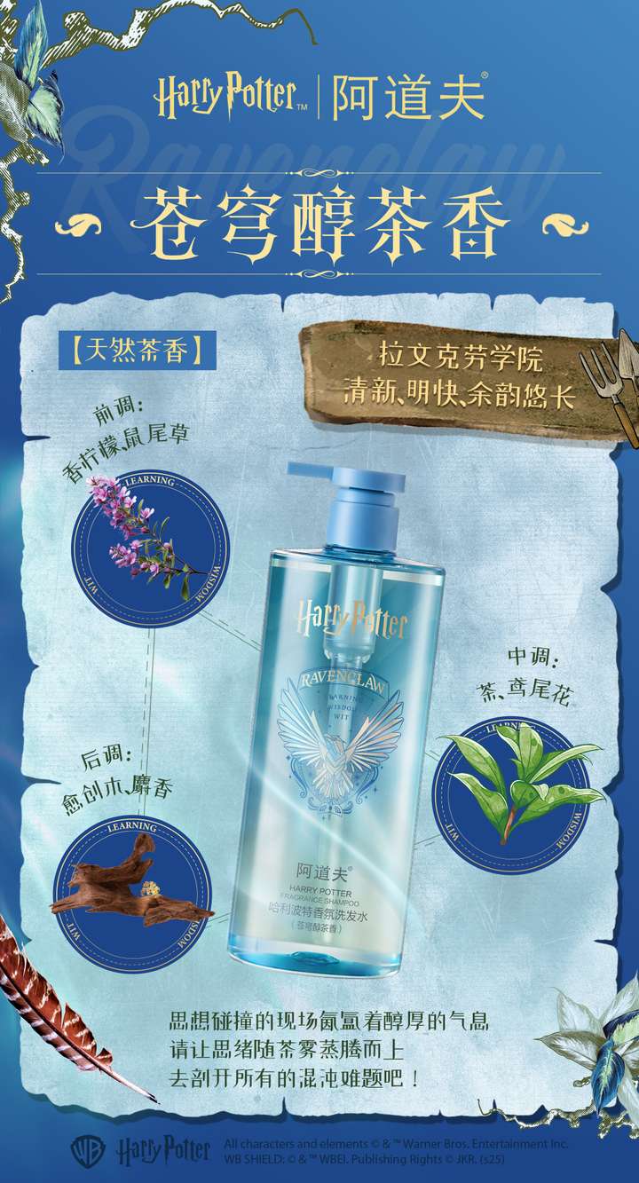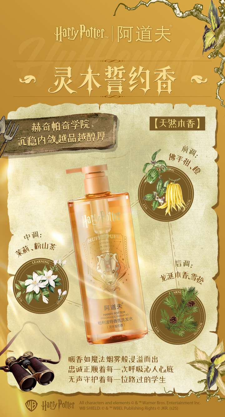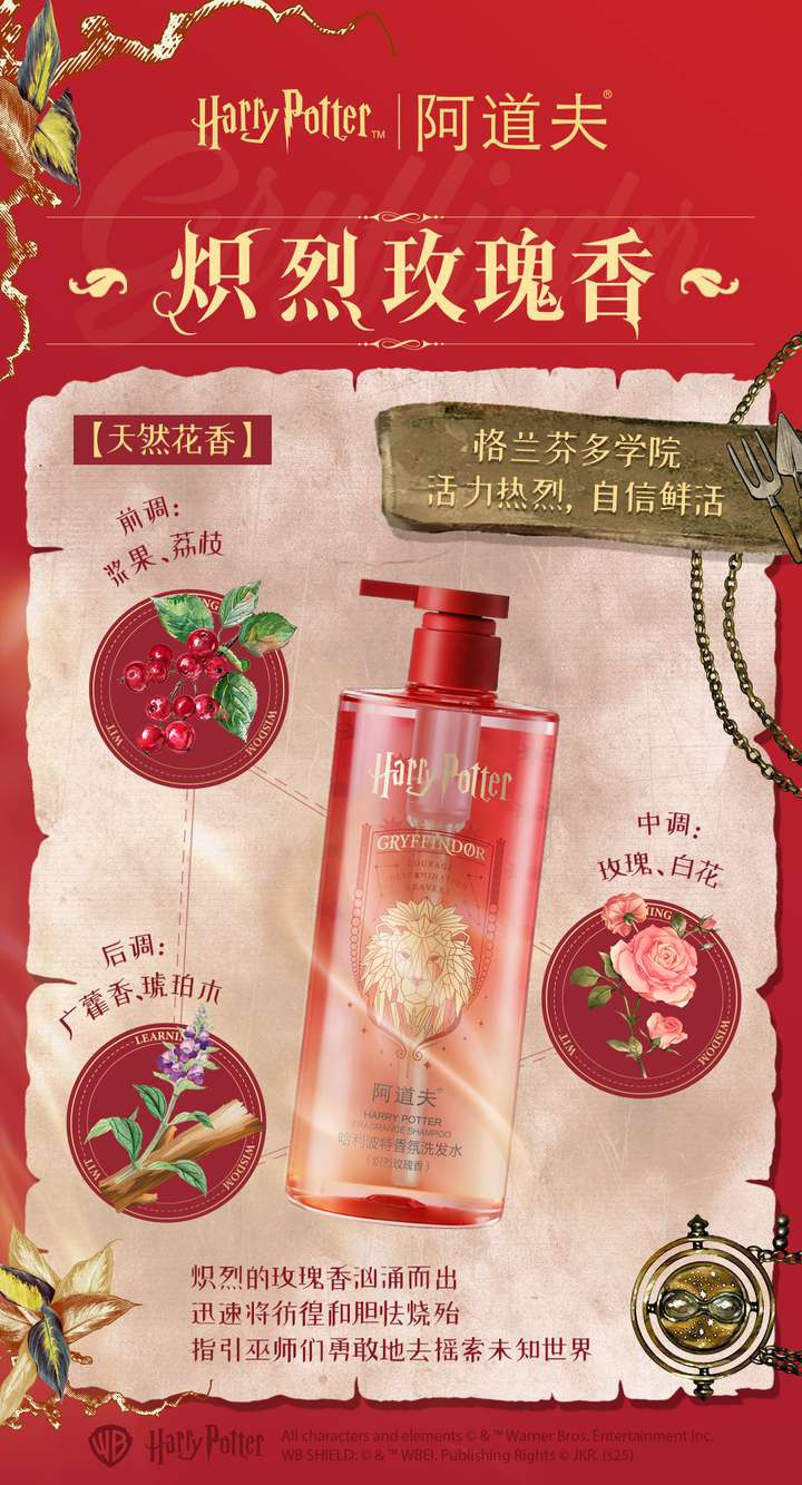 阿道夫哈利波特洗发水深度绑定霍格沃茨四大学院精神:格兰芬多的炽烈玫瑰香点燃勇气,斯莱特林的绿野荣耀香彰显谋略,拉文克劳的苍穹醇茶香唤醒智慧,赫奇帕奇的灵木誓约香传递坚韧,让每款产品都成为“有性格的香氛”。