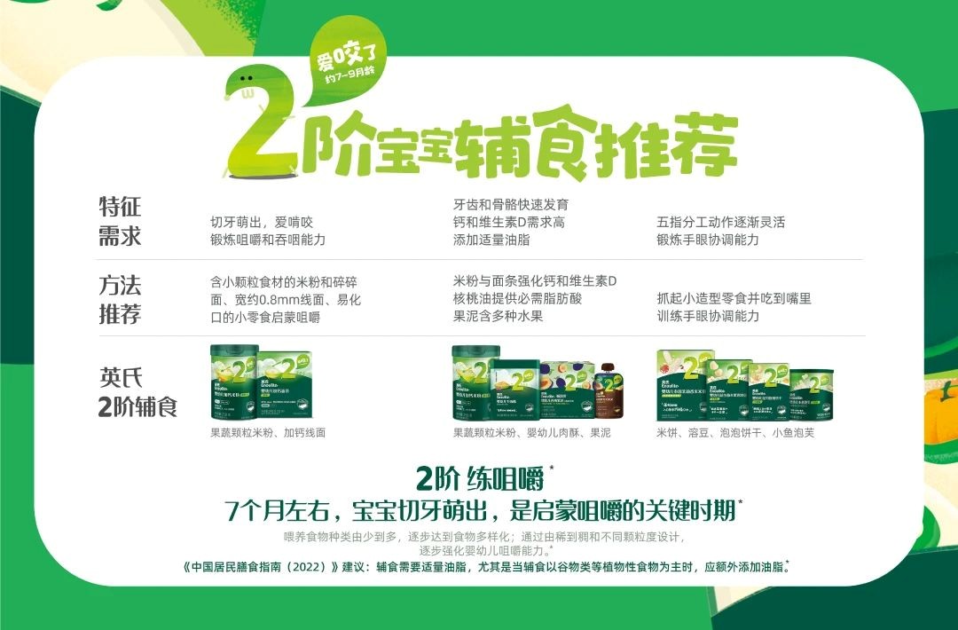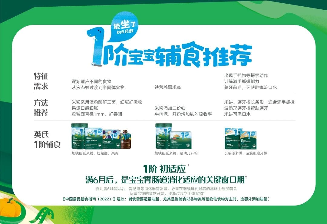 6月龄-1岁是宝宝从母乳/配方奶向固体食物过渡的关键阶段,也是肠道功能、咀嚼能力、味觉发育的黄金发展期。分阶辅食开创者英氏联合中国妇幼保健协会,在2025年再度升级的“科学5阶喂养体系”中,针对6月龄-1岁宝宝提出,“每天吃2顿英氏配方米粉”,以科学的分阶设计,让营养补给与能力发展同频。