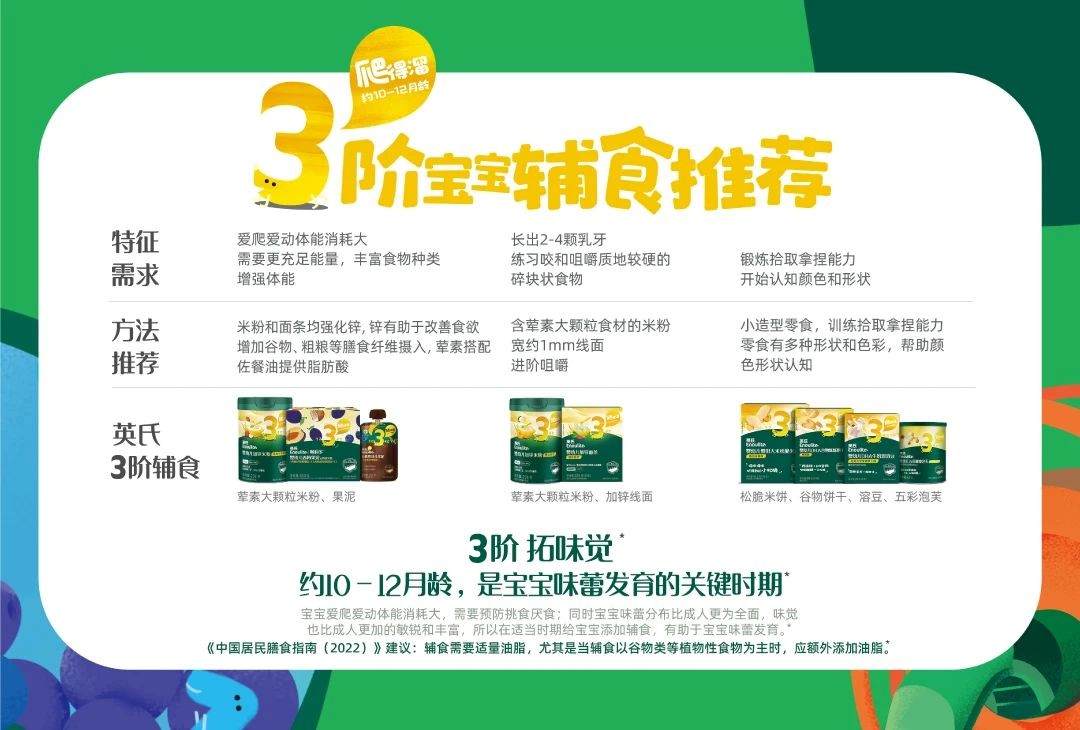 10-12月龄宝宝活动量大幅增加,体能消耗提升,且处于味蕾发育与饮食习惯养成的关键期,易因味觉单一出现挑食倾向。英氏3阶配方米粉聚焦“拓味觉”与“补能量”双重需求,强化锌元素,助力改善食欲,降低挑食风险;并引入牛肉、鳕鱼等荤素大颗粒食材进一步提升咀嚼难度,帮助宝宝巩固咀嚼能力,为后续适应固体食物做好准备。英氏3阶米粉通过多元口味与质地,来丰富宝宝味觉体验,培养对不同食物的接受度。