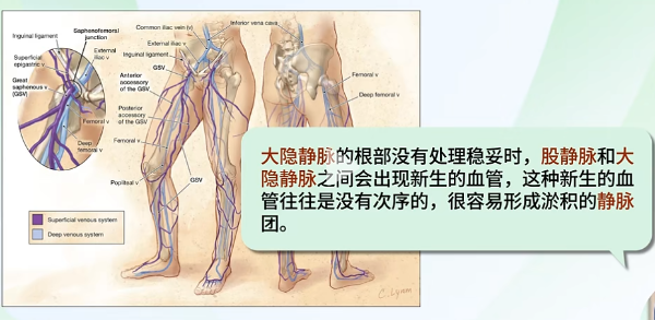 在以传统手术为主的时候,那时候复发的主要原因就是血管的新生。比如一旦大隐静脉的根部没有处理稳妥,这时候大隐静脉之间——也就是我们的股隐交接处——会出现新生的血管,就像发新芽一样。在这种前提下,静脉血管又生长出来了,而且这种新生血管往往没有次序,很容易形成淤血的静脉团。