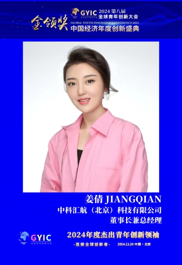 2024(第八届)全球青年创新大会(GYIC 2024)上,中科汇航(北京)科技有限公司总经理、国家二级心理咨询师姜倩女士,凭借其在“人工智能+心理教育”领域的突出创新与社会贡献,荣获 “2024年度金领奖·杰出青年创新领袖” 称号。