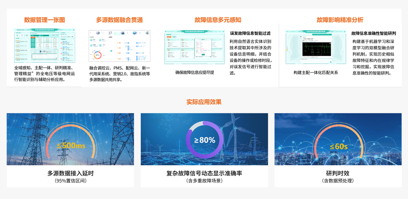 该系统深度融合配网多系统数据与AI大模型分析能力,实时接入主网调控、用采、故指、配自等多源异构数据,经标准化处理与统一分析,全面感知电网运行状态。借助AI大模型算力,故障点定位精度超80%,60秒内可完成研判;还能基于结果智能生成复电路径参考、检修优先级排序等处理建议,为运维人员提供决策依据,推动配网故障处置从“被动响应”转向“主动决策”。