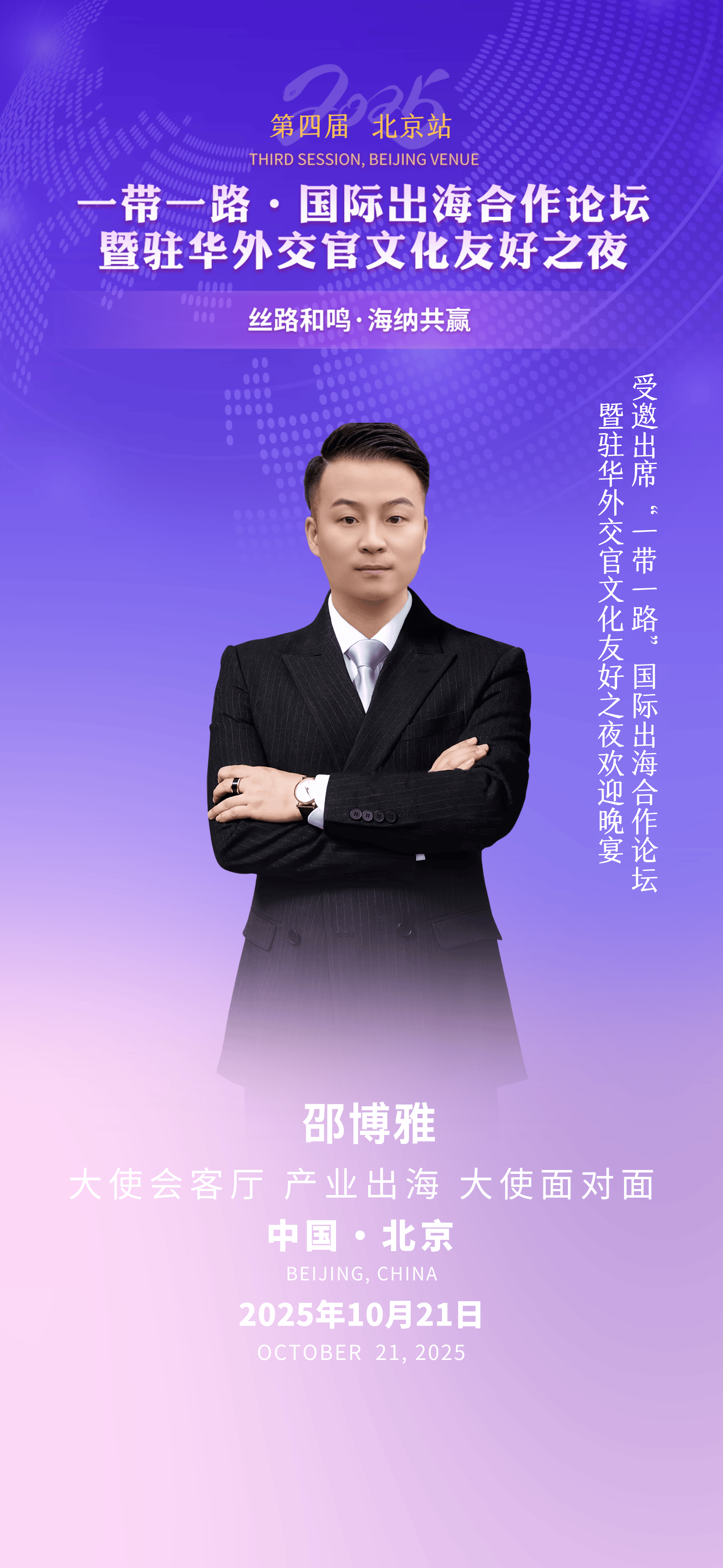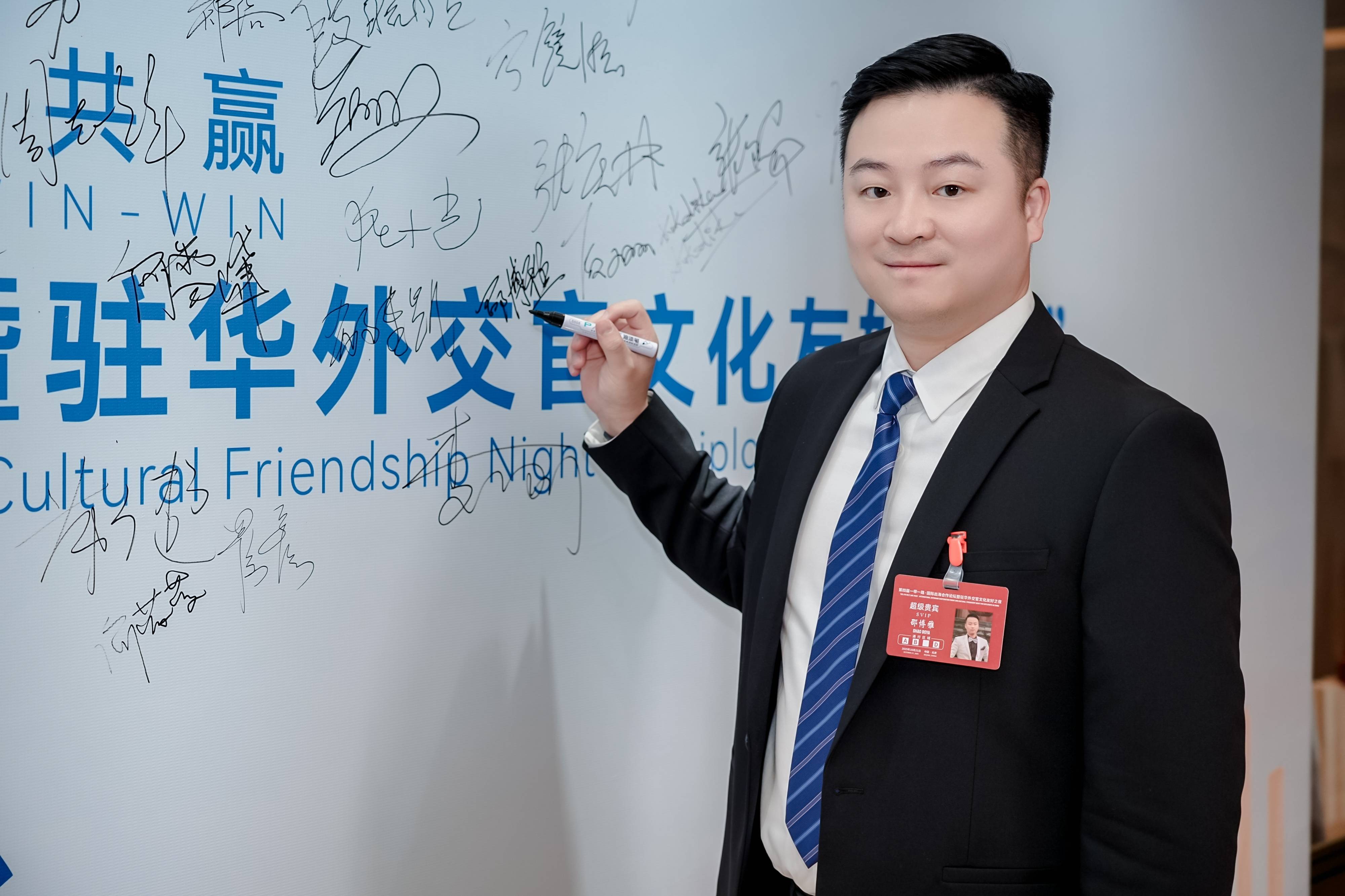 10月21日,以“丝路和鸣 海纳共赢”为主题的第四届“一带一路·国际出海合作论坛暨驻华外交官文化友好之夜”在北京盛大启幕。优秀青年企业家、新疆华康包装有限公司与新疆天鑫矿业工程有限公司等多家企业总裁邵博雅受邀出席,与各国驻华外交官、行业精英共话国际合作新机遇,展现中国新生代企业在“一带一路”倡议下的探索与担当。
