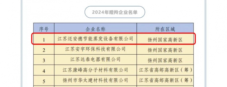 这种能力使其应用场景极为广泛,横跨环保、化工、制药、新能源、食品饮料等众多行业。无论是高盐废水资源化处理,还是锂电原材料制备、生物发酵液蒸发浓缩,迈安德都能凭借技术沉淀,保证蒸发结晶品质的稳定与生产过程的自动高效。2024年,江苏迈安德节能蒸发设备有限公司成功上榜瞪羚企业名单,正是对其创新能力强、发展速度快、市场潜力大的官方认证,清晰印证了企业在专业领域内的技术领跑优势。