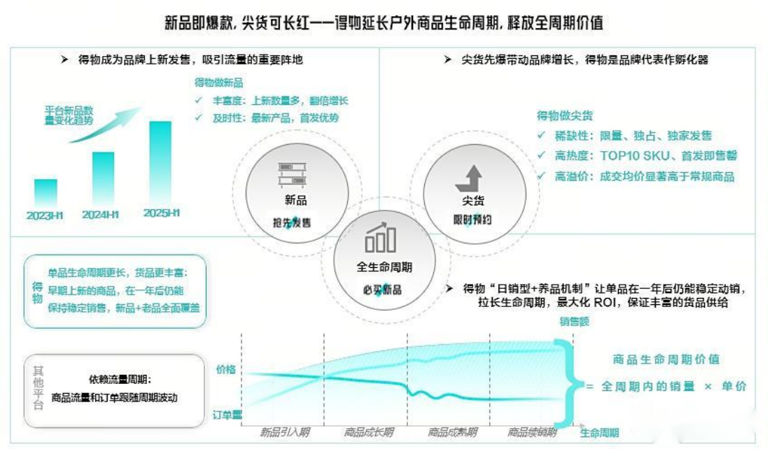 用户需求的升级直接推动行业进入"大单品"时代。Z世代中64%的用户会在购买前深入研究商品功能特性,对单品的关注度甚至超过品牌本身,近90%的受访者认为户外品牌必须拥有代表性的出圈单品。而得物App凭借独特的"日销+养品"机制,成为品牌孵化经典单品的核心阵地:凯乐石大坡王越野跑鞋上架后迅速登顶国产越野跑鞋客单价榜首,累计GMV超2500万元;MONTBELL抓绒衣、KEEN溯溪鞋等单品更是贡献了品牌70%的销售额,部分商品上架两三年后仍能保持稳定销量,打破了户外单品"爆款易逝"的行业痛点。